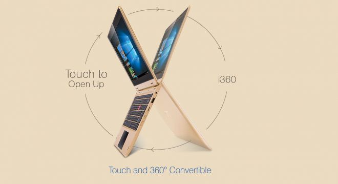 Non ci sono molte informazioni tecniche sulla costruzione della scocca, mentre per quanto riguarda il display troviamo un pannello HD Touch da 11,6 pollici, gestito dalla grafica di un SoC Intel Z8300 (Quad-Core da 1,8 GHz). Essendo un convertibile, il display può essere ruotato di 360°, permettendo 4 diverse modalità di utilizzo: Laptop, Tablet, Stand e Tent.