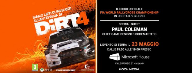 Alla Microsoft House di Milano, un evento speciale dedicato alla community organizzato da Koch Media e Xbox darà la possibilità di provare in anteprima nazionale l'attesissimo titolo di casa Codemasters, DiRT 4.