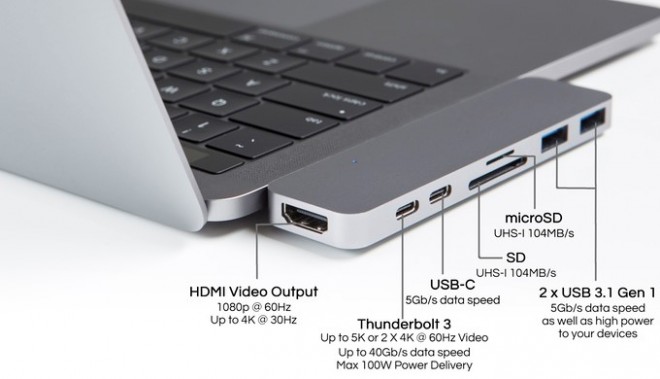 Ben 20 mila backers hanno preferito spendere 69$ e risolvere in un colpo qualsiasi problema di porte, non solo quello relativo allo slot SD. HyperDrive sfrutta infatti le due porte USB-C (sono delle Thunderbolt 3) per ampliare a dismisura la compatibilità dei nuovi MacBook: HDMI output, 1x Thunderbolt 3, 1x USB-C standard per trasferimenti a 5Gb/s, lettore SD (UHS-1 fino a 104MB/s), lettore microSD (UHS-1 fino a 104MB/s) e 2x USB 3.1 Gen 1. Il tutto in un design semplice, pulito e in colorazione simile a quelle del terminale Apple per una continuità che agli utenti piace.