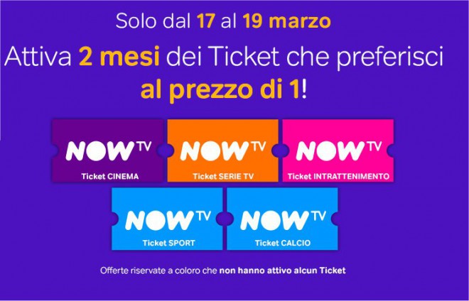 NOW TV, la piattaforma in streaming di Sky, ha organizzato una serie di offerte per la festa del papà. Dal 17 al 19 marzo è possibile acquistare uno qualunque dei Ticket proposti (i pacchetti tematici che compongono l'offerta) con 2 mesi di visione al prezzo di 1.