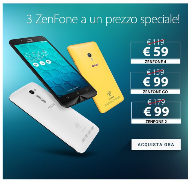 Nuova promozione da parte di Asus sull'acquisto di tre terminali Zenfone, proposti ad un prezzo davvero interessante e naturalmente scontato rispetto a quello di listino. I tre modelli interessati sono nello specifico Zenfone 4, Zenfone GO e Zenfone 2, che dalle 10.00 di oggi e per le successive 48 ore, godranno di sconti fino al 50 %.