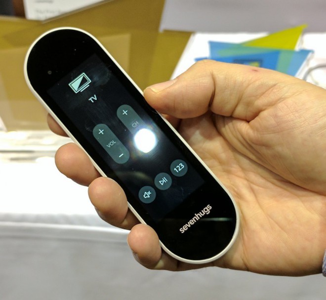Sevenhugs ha portato al CES 2017 il suo Smart Remote. Avevamo già parlato di questo prodotto in occasione della campagna di crowdfunding conclusa a Novembre. Come si può intuire dal nome, si tratta di un telecomando universale dotato di touchscreen capacitivo. Se lo scopo è comune a quello di tanti modelli presenti sul mercato, il funzionamento presenta invece alcune importanti differenze. In dotazione vengono forniti tre sensori (alimentati da due batterie AAA) da posizionare all'interno dell'ambiente (lo stesso dove verrà utilizzato il telecomando: non è possibile coprire tutta l'abitazione). I sensori operano in sinergia con l'accelerometro, il giroscopio e la bussola integrati nel telecomando.